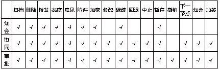 【会签】由多个部门人员共同签署。会签节点可以进行“态度”,“意见”,“意见隐藏”,“添加附件”,“修改正文”。其操作可以是“撤销”,“知会”,“加签”,“回退”,“终止”,“暂存待办”;