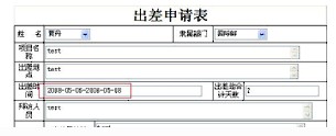 表单的出差时间是手工填写的,格式为:2008-05-06-2008-05-08,原表单使用日期型控件不支持手工填写这种格式,如图: