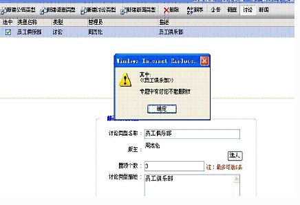 如果在讨论类型下发布过讨论并且没有删除的话,讨论类型是不允许删除的,这时就会有系统提示,但是如果该讨论类型的版主已经彻底将讨论信息删除后,这时再删除讨论类型就不会再有系统提示了。