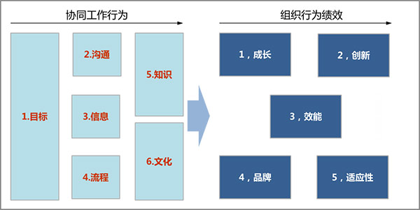 借用欧盟通用绩效评估框架模型的思路,并查阅中外文献,针对中国企业组织的行为,我们提出了初步的绩效评估框架模型。组织行为绩效评估框架也包含两大类要素:协同工作行为要素,以及组织行为绩效要素。我们与欧盟通用绩效评估框架的区别是,我们集中于研究:协同工作行为是如何影响组织行为绩效的。