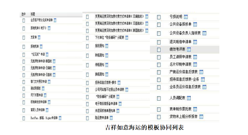 吉祥如意海运的模板协同列表 自2007年致远A6协同上线以来,得到吉祥如意管理层高度认可,迅速在公司内部普及开来,其并发数也从最开始的40并发,一路升级到100并发,目前经常会出现满并发的情况。而对于系统的运行,张宝杰认为致远A6的运行也符合其理念,即一个系统应用好的标准,“就是大家都漠视你的时候真的才叫好,真正好的东西是没有问题的。” 协同让企业文化更强劲