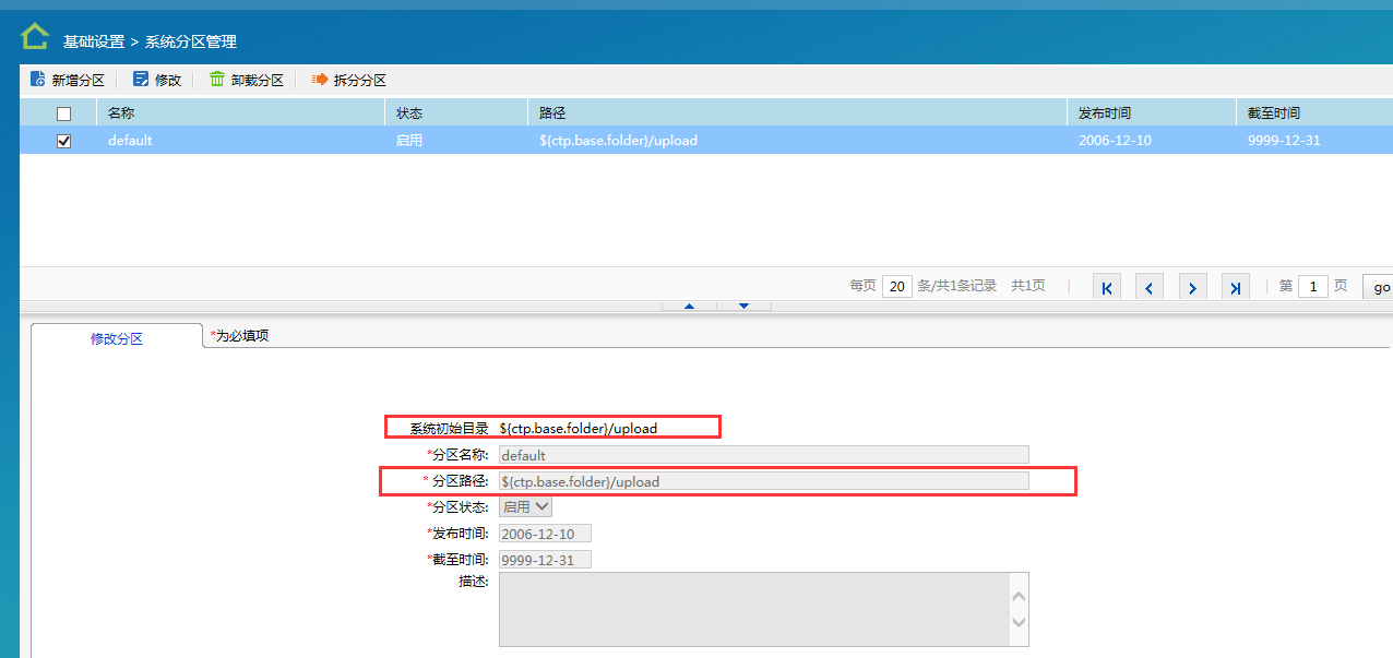 目前V5客户在卸载产品之前,请务必先确认附件upload是否存储在默认分区路径下,如果存储在默认分区路径下,请在卸载协同产品之前,将整个/base目录进行备份,否则在产品卸载时,将会把base文件夹全部删除,从而导致上传到协同中的附件、office类型正文等内容全部丢失。如果附件upload不是存储在默认分区下,卸载产品前就无需备份base目录了。 V5产品upload分区默认存储路径:登录登录system账号,在“基础设置——系统分区管理”中,如果“分区路径”设置的是:OA程序目录aseupload或者如下图所示的初始目录“${ctp.base.folder}/upload”,则证明upload存储在默认分区路径下。