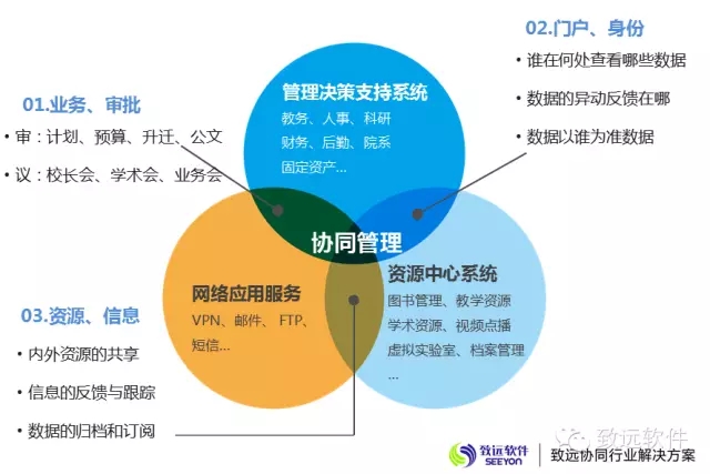 需要正视的是:我国高校信息化建设起步相对较晚,信息服务于教育的链条相对较长,数据的重构优化工作也相对较重。但普通高校、高职高专、基础教育虽属于不同类型的教育实体,有着不同的信息化基础和侧重,但在行业的发展推动下,我们面临的管理需求是一致的。 学校各职能部门的业务系统建设比如学生工作管理系统、教务管理系统、HR系统、教师管理系统、财务管理系统、固定资产管理系统等提供管理决策支持的业务系统,各自相对独立,受众是相关职能部门人员,属局部、小众。 而资源管理系统,比如图书资源、教学资源、学术资源、档案受众较广,但对使用者的角色有所筛选;从这些系统我们不难总结出这些系统的特点是业务数据流,数据的逻辑计算是这些系统的强项,报表和资源成为供管理者做决策时的重要数据来源。 这些数据的产生、变动、使用不是一两个人完成的也不是小众能决定的,管理者在何处查看哪些数据?有重复数据时以谁为准,有没有统一的平台去审阅这些数据?这是我们所关心的问题。 其次,网络应用服务作为信息化校园建设的基础应用,将业务系统的信息在一定程度上共享、传阅,但当我们的管理者需要做教学计划审批、经营费用预算、职务的呈报、师资派遣、公文流转时大量的办事表格和文件成为我们的办公载体。另外,大家有所感受到咱们的会议特别多,校长办公会、党务会、学术会、业务会、例会,在座的各位都应该有切身体会,这些会议不仅仅指会议现场,从会前的会议呈报、审批、材料收集、通知、议题决议、做会议纪要,转公文等等我们需要一个既可以审、又可以议的协作平台去减轻工作量,理顺思路、过程记录、意见振荡。 大量的工作文件堆放在办公桌时,我们时常忘记了该做什么,先做什么,需要资料是在哪查,业务系统谁管,我怎么找他要?要来的数据准不准,可见信息的共享和推送是当前业务数据流(业务系统)不擅长的。 除了刚才横向的比较,我们再从纵向管理思维看看信息化: