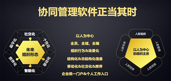 对于新的协同理念,徐石表示:“所谓新协同,就是说协同管理在基础定义上已经发生了变化。我们强调协同管理的根是‘以人为中心’,这是与其他管理软件不同的出发点、思想和理论基础。我们关注组织中最重要的要素——‘人’,我们关注软件如何为组织赋能、如何激活个体,而不是将人束缚在系统中间,变成工作和业务流水线上的‘工具’;我们需要在以人为中心的基础上来设计和构建协同管理的应用和服务。”