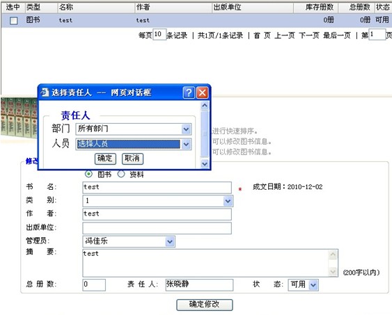 可以。登录图书管理员帐号,在图书资料管理中,找到需要修改负责人的图书后,选中,界面下方就会显示修改信息,在负责任处点击后就会弹出选人界面,重新选择负责人后保存就可以。如图: