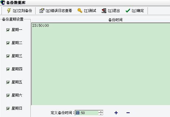 在设置窗口“备份星期设置”中,勾选对应备份星期,在“定义备份时间”中设置好时间后点“+”让时间在上方空白区域中显示,点确定即可。
