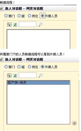 在员工通讯录均看不到,外部人员所属管理部门之外的人员新建流程时也看不到外部人员的单位和人员