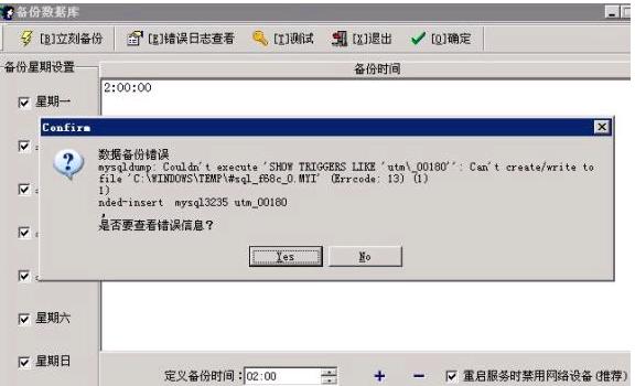 不能生成自动备份时,可以到C:/WINNDOWS/temp/ 中将 .MYI文件删除,然后可以生成备份文件